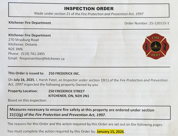 Today, on October 16, 2025 I observed the following inspection order issued by the fire department that was posted by the elevators on the ground floor of 250 Frederick St: