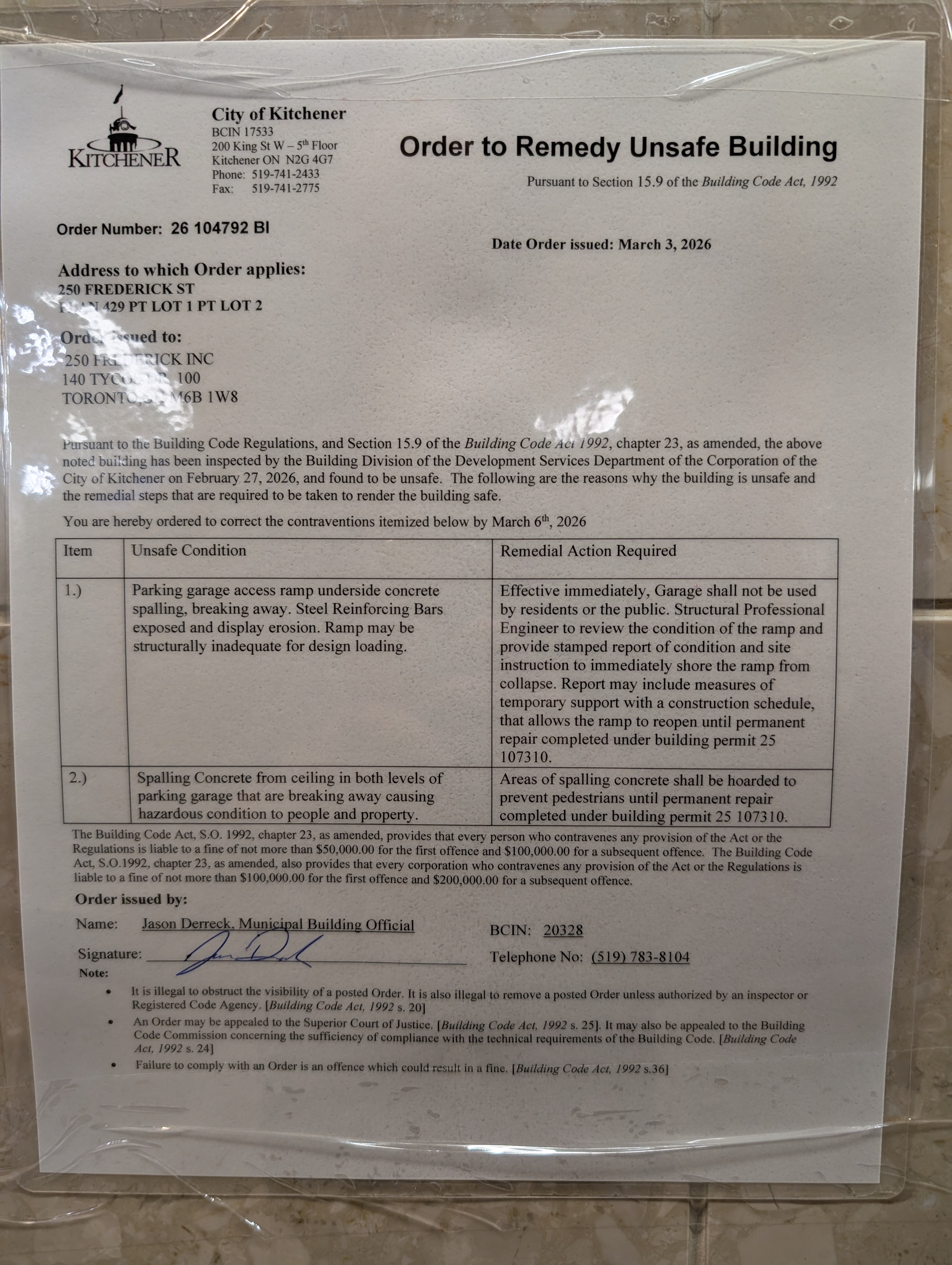 Today, on October 16, 2025 I observed the following inspection order issued by the fire department that was posted by the elevators on the ground floor of 250 Frederick St: