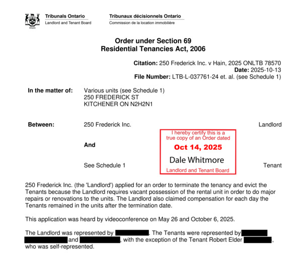 Here is the 10 page order from the landlord and tenant board ordering that the remaining 17 N13 eviction applications against tenants at 250 Frederick be dismissed: